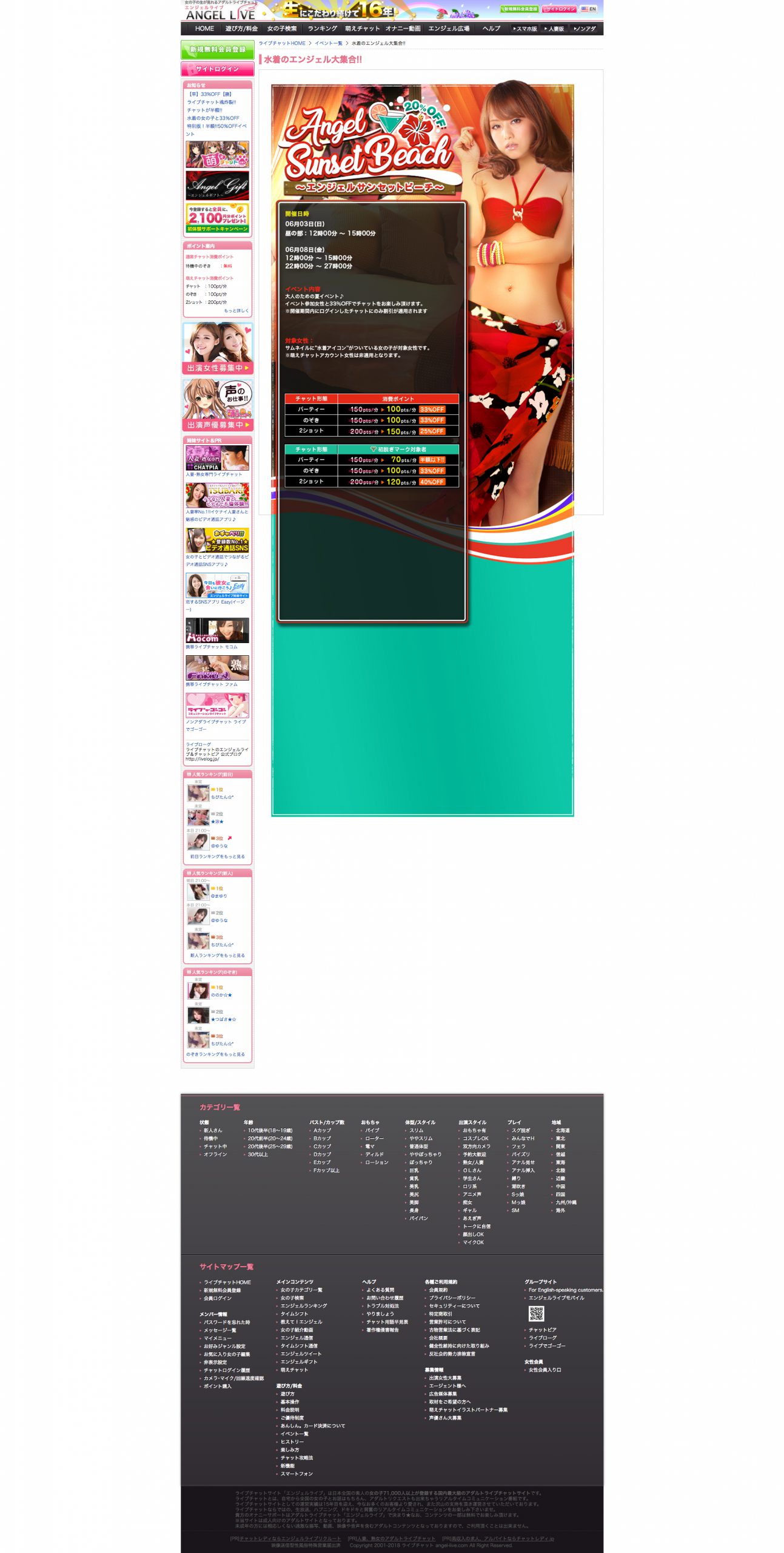 Angel Liveエンジェルサンセットビーチ グラフィック ライブチャットサイト「Angel Live」内イベント販促ページを作成しました。 大人な水着イベントというところで夕日とトロピカルな雰囲気をイメージして作成しました。